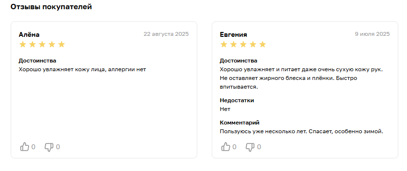 - Состав: комплекс мощных увлажнителей (гиалуроновая кислота, мочевина, глицерин) и липидовосстанавливающих веществ (церамиды, сквалан, натуральные масла). Без парабенов, агрессивных ПАВ и отдушек.